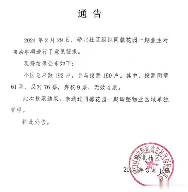 根据通告,2024年2月29日,硚北社区组织同馨花园一期业主对自治事项进行了意见征求。小区总户数192户,参与投票150户。其中,投票同意61票,反对76票,弃权9票,无效4票。此次投票结果:未通过同馨花园一期调整物业区域单独管理。