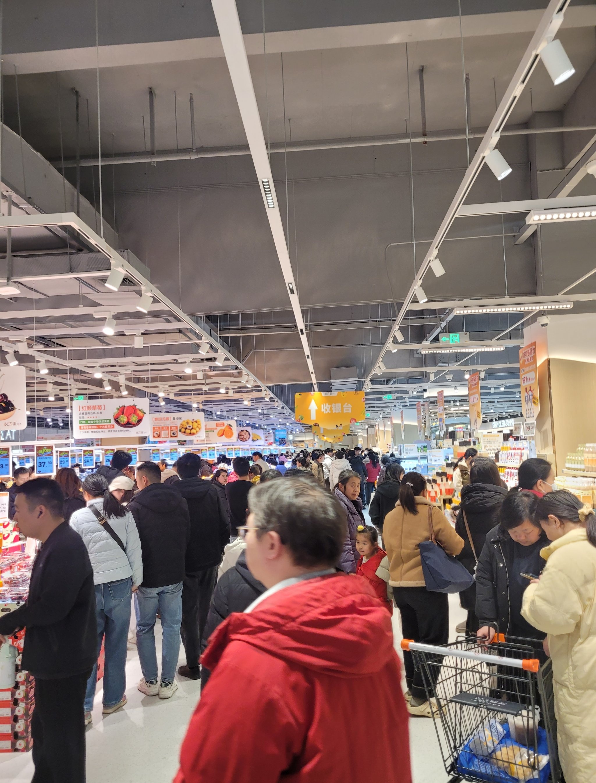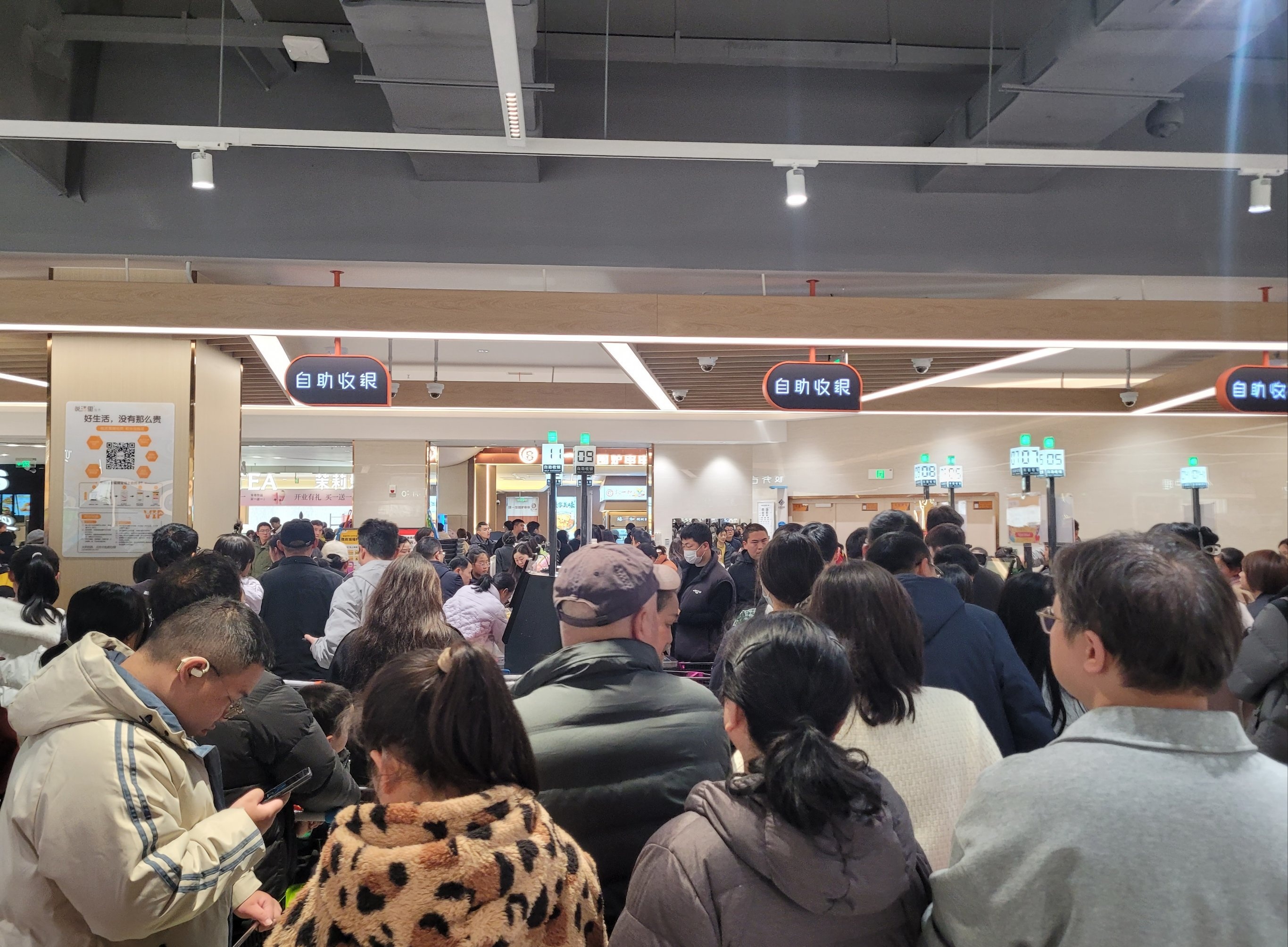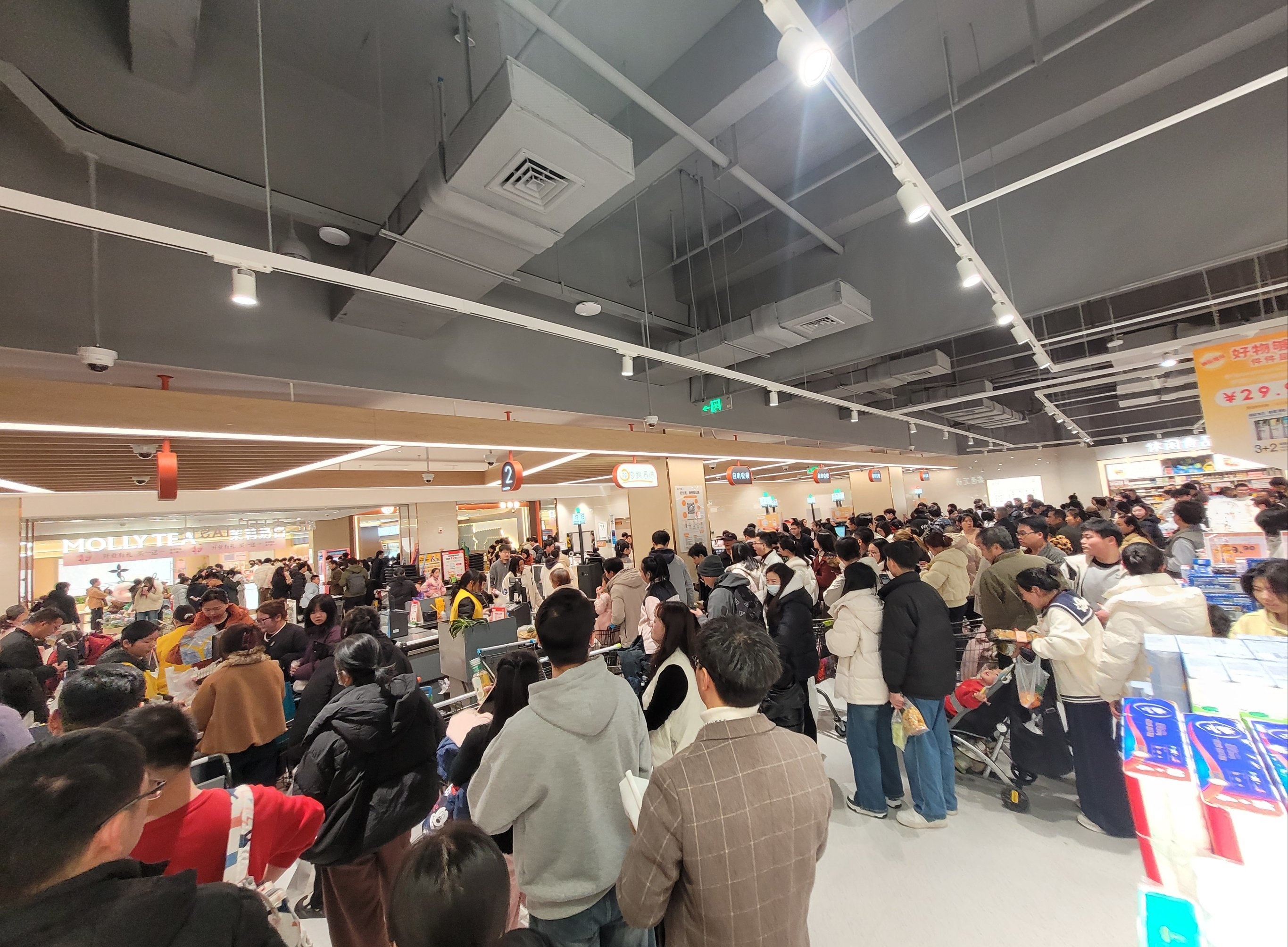 光谷南的星悦广场已经开业10天了,想着人流量会不会比开业时少一点,顺便去负一楼的悦活里超市买点熟食和水果。结果这人流量彻底让我崩溃!!!完全是人挤人模式,挤得水泄不通,前胸贴后背。好不容易选好东西准备结账,排队就足足排了半个多小时(最后一张图)。