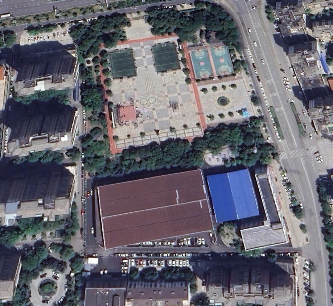 天冰的面积,比黄陂前川的黎元洪全民健身中心面积还大(这个广场不算羽毛球馆只有1.9万平米),所以是完全可以建设体育运动中心的,下图为前川全民健身中心的卫星图片,北面是足球场和篮球场,中间是广场,南侧是羽毛球馆
