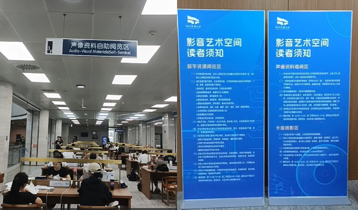 影音艺术空间内,最亮眼的当数声像资料自助阅览区和卡座观影区。在声像资料阅览区,你能看到各类音像影碟,包括以CD、VCD、DVD、蓝光影碟等形式为载体的中外电影、专题纪录片、电视连续剧、歌曲及戏曲碟等,其题材种类涉猎之丰富,年代跨越之久远,令人眼前一亮。