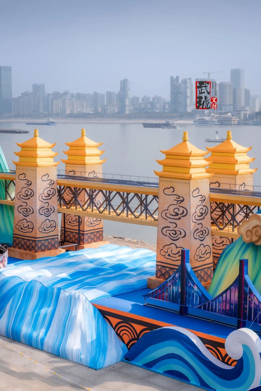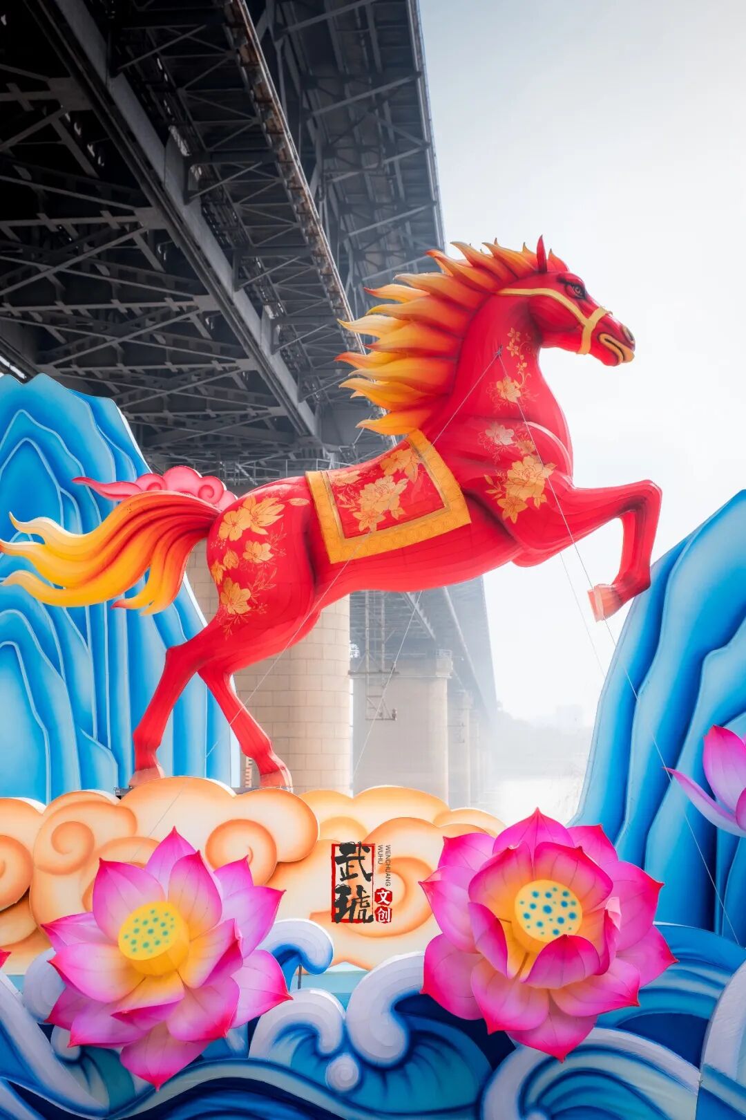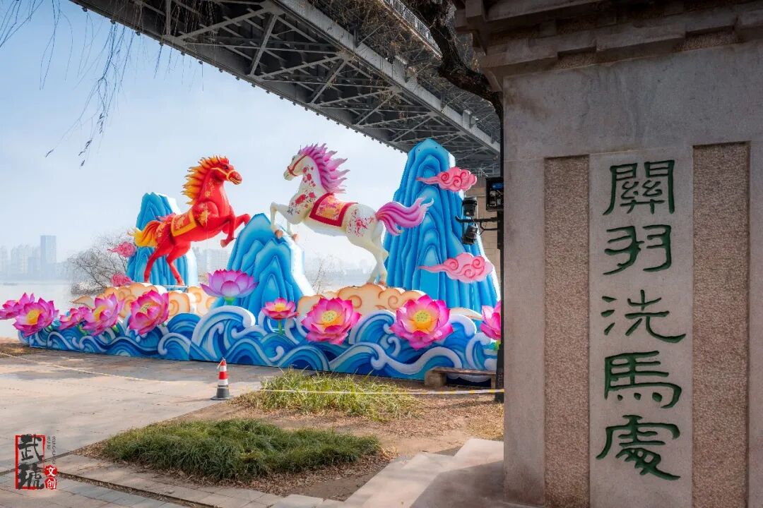 位于武汉长江大桥正下方的“一马晴川”灯组