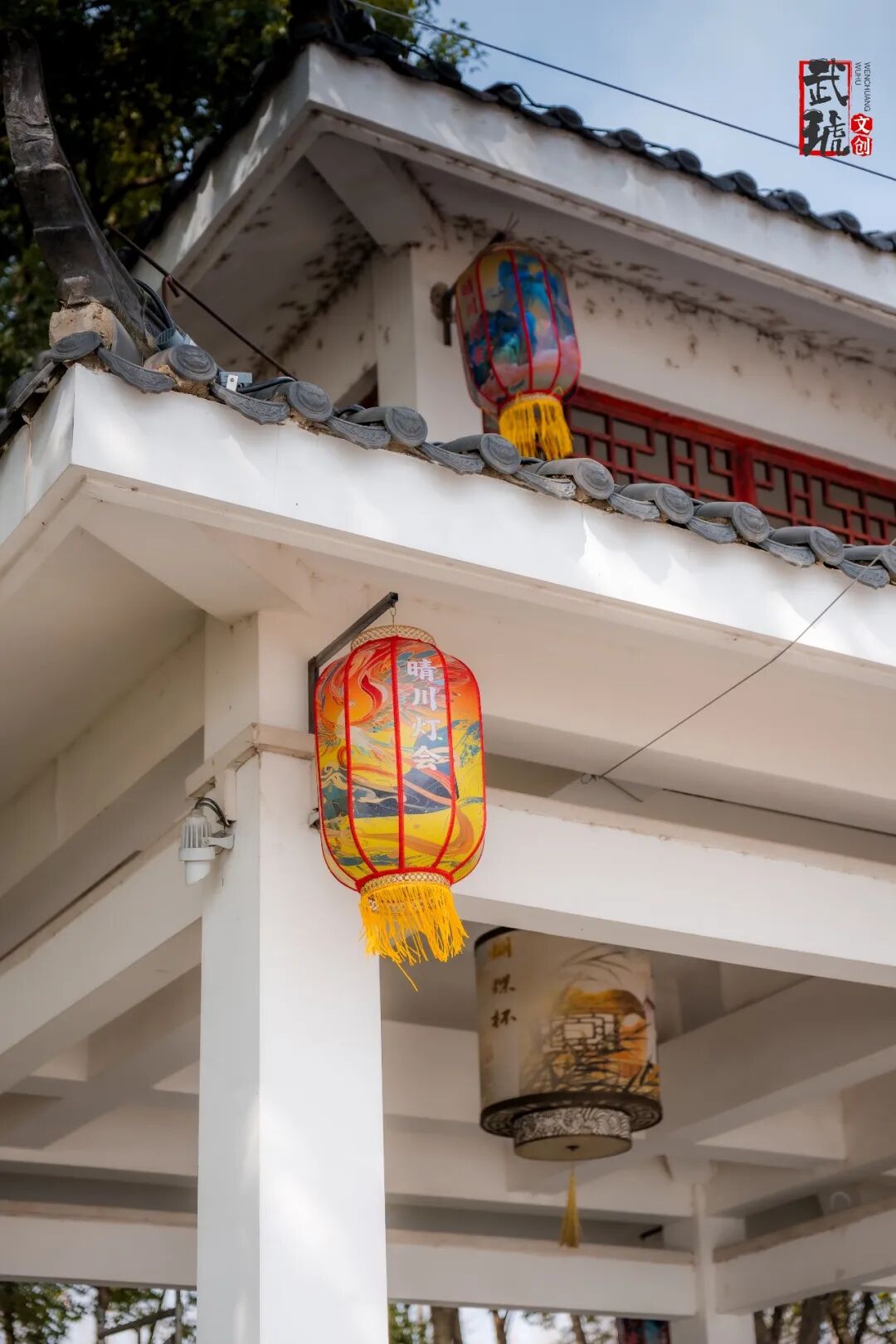 步道上方和两旁的路灯挂上了灯笼