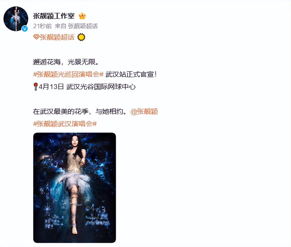 随后,张靓颖工作室回应:“邂逅花海,光景无限。张靓颖光巡回演唱会武汉站正式官宣!4月13日,武汉光谷国际网球中心。在武汉最美的花季,与她相约。”