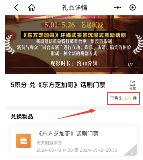 咵天剧游乐园免费送票 限量赠送520张《东方芝加哥》环绕式实景沉浸式互动话剧门票,世界城会员扫码5积分兑换《东方芝加哥》门票一张(小程序签到一天即可获取5积分) 数量有限,兑完即止,每个账号限兑2张。 截止至18:00点,已售出277件,门票还有剩余!